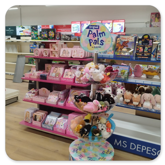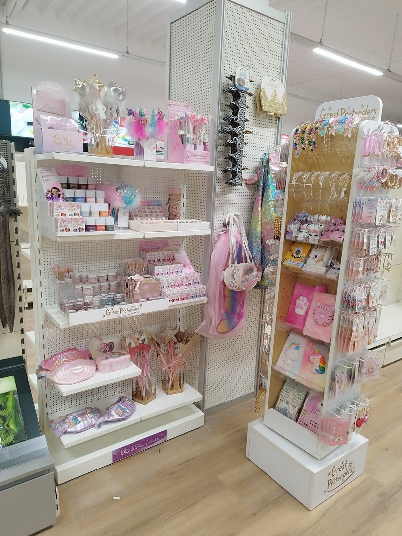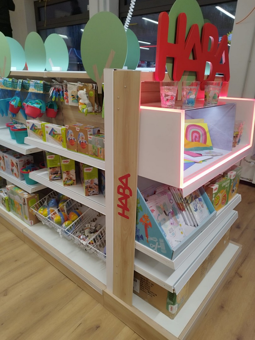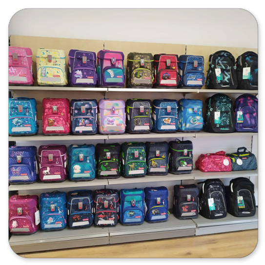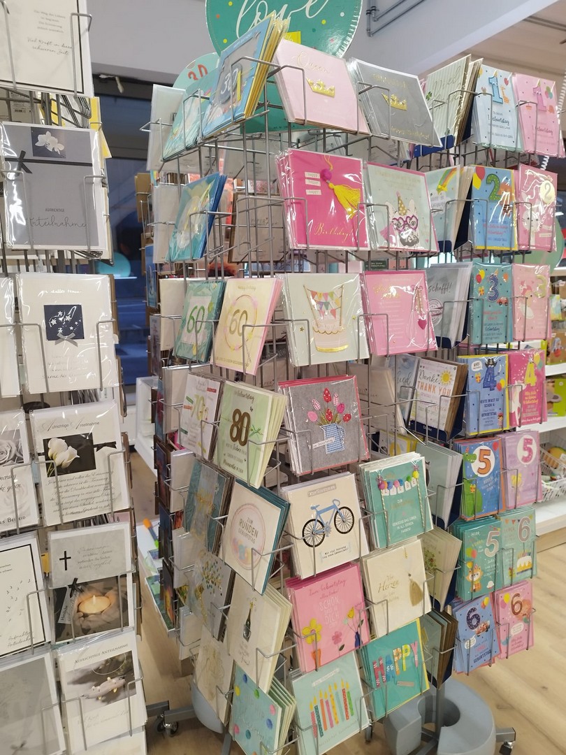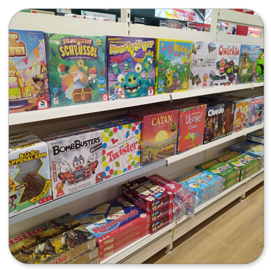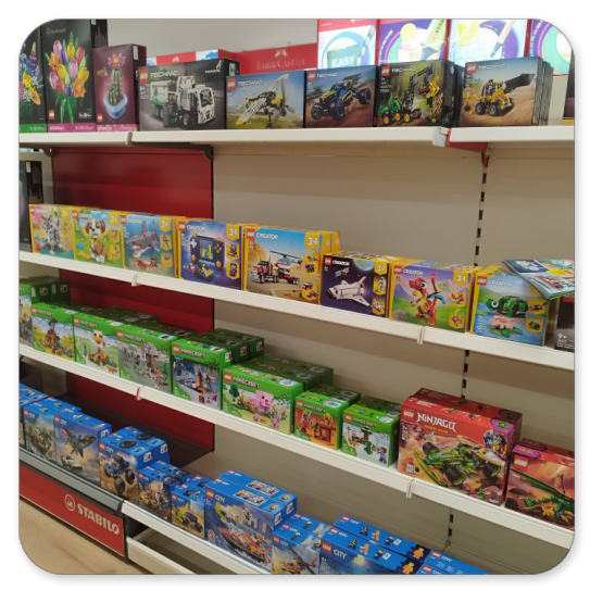 Schreibwaren, Büro-, Kreativartikel, Spielwaren im Verkaufsbereich.