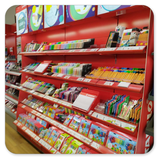 Im Schreibwaren- und Bürobedarf-Fachhandel.